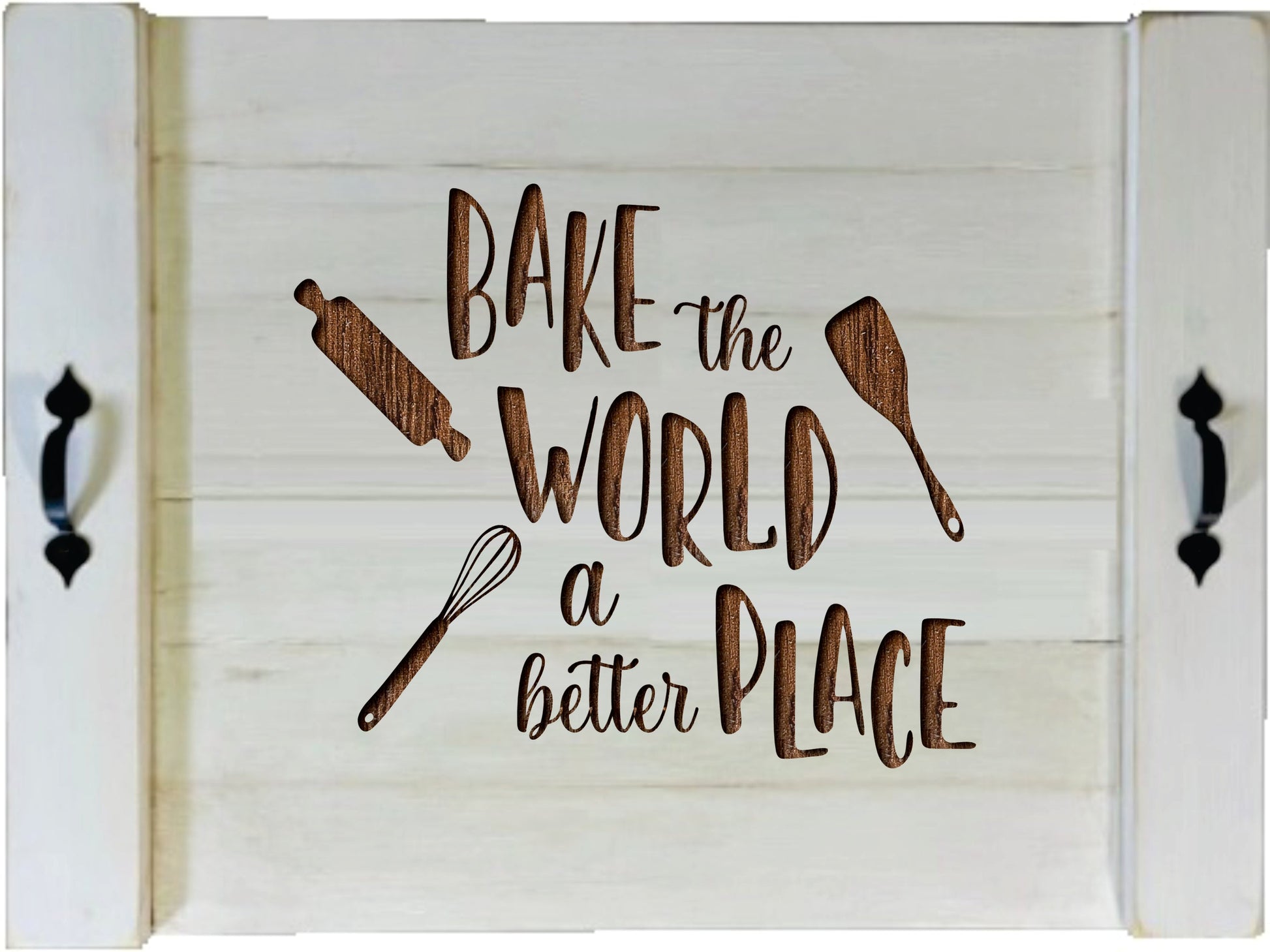Bake The World A Better Place Wood Engraved Noodle Board - Stove Cover - Sink Cover - With Handles - Gas or Electric Stove