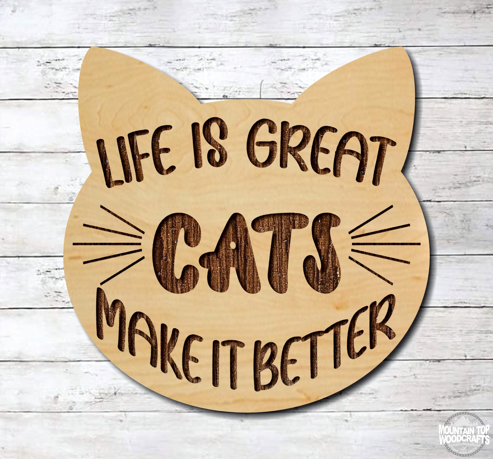 Life Is Great Cats Make It Better ~ Pet Animal Kitty Face ~ Laser Engraved Sign Wood Wall Art